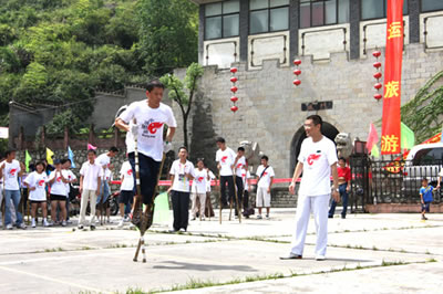 張家界高花燈亦稱高皇燈,是流行于永定沅古坪一帶富有民族特色的舞蹈。表演時,12人至24人不等。配有鑼、鈸、嗩吶、鼓等樂器。每人手中拿一盞紙扎燈籠,內點蠟燭兩根,頂扎一木偶像,用五色紙剪成戲文故事如“八仙” 、“瓦崗寨”,“梁山英雄 ”之類。高花燈表演有一套程式,要求東起西落,進一個“半邊月”,出一個“月團圓”,舞個“太極圖”。亦可進民房表演,叫“愿燈”,多為祝福、還愿或為某家喜事湊趣。打吆喝、打口哨則只能到戶外表演,叫“眾燈”,是讓大家看的。其形式又分民燈、戰(zhàn)燈。前者表演 古代先民的遷徙、繁衍、勞動、生活;后者表演打仗破陣。隊形變化有“織籬笆”、滾柱頭”、“十八斗”、“螺螄轉頂”、“八卦陣”、“過天星”、“一字長蛇”等二十余種。如破“象棋盤陣”,主人插三十二根香,擺成棋盤陣,表演時,主人舉紅傘,玩燈者舉黑傘,從河道進,將眾“子”一一吃掉(即踩香),這是斗智的競賽。只見燈火如流星般穿插舞蹈 ,旁邊配以龍燈互舞(配龍玩燈,是高花燈的主要特點之一),那激起的鑼鼓聲、吆喝聲、口哨聲,掀起有節(jié)奏的聲浪,熱烈而歡快。