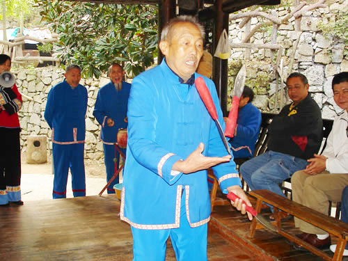 三棒鼓,唐代稱三仗鼓,約于明代傳入張家界,并逐漸成為群眾喜聞樂見的民間藝術形式。每年春節(jié),藝人們結伴走村串寨拜年,表現對象不分貧富,戶戶必到。如遇貧寒之家,表演者將別家贈送的禮品相送,意在人人過節(jié)歡喜。充分體現出土家人熱情好客,心地善良的民族性格。對加強民族間團結有一定的作用。三棒鼓 通常由三至五人組成,一人擊鼓唱詞,一人鑼鼓配樂,一人耍花棒。花棒三根,長一尺,舞者左右 各執(zhí)一根,將另一根拋在空中,左右開弓,擊打空中花棒使之不落地。也有以刀代棒,以五刀代三棒的技藝。鋼刀在空中歡跳,銀光閃閃,左右穿梭。技藝高強者,突然把刀拋得及高,來一個騰空飛腳,轉身外擺,繼續(xù)接刀上拋,令人眼花繚亂,不禁稱絕。打三棒鼓,通常有“鬧春耕”、“收割打場”、“慶豐收”、“拜年節(jié)”四套,分“鯉魚跳龍門”、“玉女穿梭”、“板巖漂灘”等項目。打三棒鼓技巧性強,表演時需高度集中,用力適當,貫通一氣,并與演唱者默契配合。