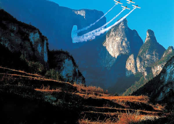 天門洞風(fēng)光圖片 天門洞景觀 1700多年來,這一道奇絕天下的勝景吸引著無數(shù)的探訪者趨之若鶩。特別是在1999年,世界特技飛行大師駕機(jī)穿越天門洞,在全球引發(fā)了轟動(dòng)效應(yīng),收看現(xiàn)場(chǎng)直播的觀眾達(dá)到8億之多。