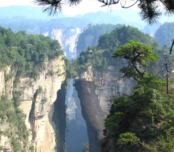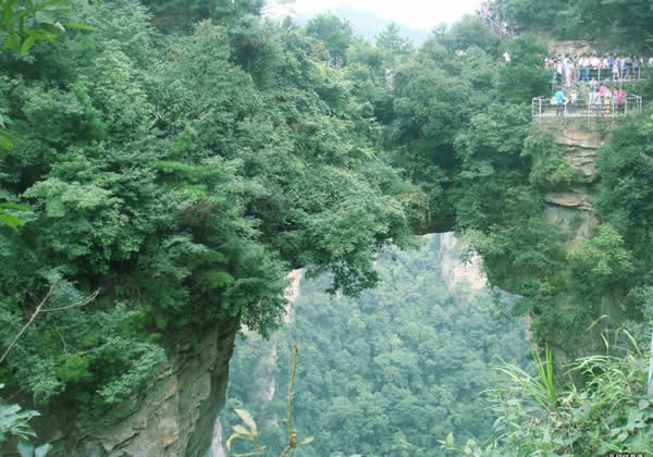 張家界天下第一橋 “天下第一橋”。橋長20米,寬僅1.5至3米不等,但較平坦,可通行人。橋上蒼松挺拔,橋下云霧蕩漾,萬丈深淵。四周懸崖絕壁,水滴飛濺。踏上橋面,使人有凌空御風之感。手扶鐵欄桿,仰視,青峰飄渺于云靄繚繞之中;俯瞰,奇峰如筍群,巖壑深谷中陣陣煙嵐泛起,散而復聚。這里是張家界風景一絕,是大自然的一個奇跡。您看,兩座山峰被一條長廊連在一起,形成天然橋洞,平時吞云吐霧,氣勢壯觀雄奇.橋面寬約兩米,長20余米,絕對高度350米。橋上蒼松挺拔,橋邊古藤垂掛,橋下深不可測。遠觀此橋,云霧繚繞,橋身若隱若現(xiàn),好似水中倒影一般。走在橋上,只見霧氣蒸騰,松濤呼嘯,石橋好像也顫顫悠悠,晃晃搖搖似的,令人驚心動魂。這里是張家界風景一絕,是大自然的一個奇跡。