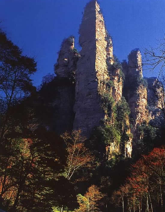| 金鞭巖:過“閨門峰”沿溪而下約500米,有一座高約400米,孤標直立,雄奇挺拔的奇峰,名金鞭巖。金鞭巖是武陵源著名景點,峰體上細下粗,四棱分明。棱面布滿節(jié)理橫紋,形成鞭節(jié),渾如一根豎插大地的長鞭。每當夕陽晚照,鞭身涂金,熠熠閃光,瑰麗奪目,構成一幅奇特壯美的“夕陽金鞭圖”。