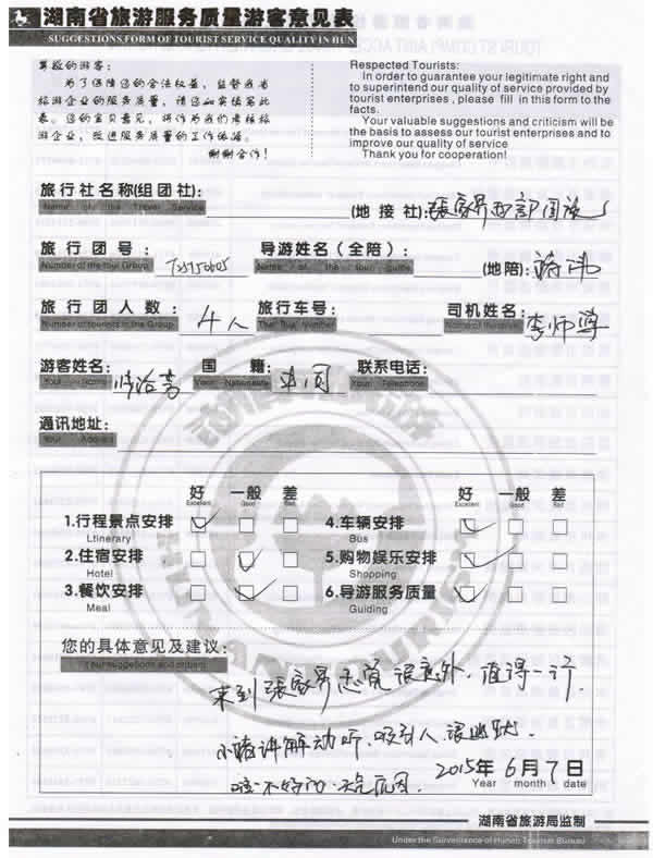 5月下旬,上海張女士一行四位貴賓與湖南西部(張家界)中國(guó)國(guó)際旅行社工作人員——龔玲取得聯(lián)系,經(jīng)過商談,雙方達(dá)成協(xié)議并簽訂旅游合同,于6月4日抵達(dá)張家界,開始張家界之旅。此次行程是由我社優(yōu)秀導(dǎo)游——褚偉,負(fù)責(zé)旅游接待工作,褚導(dǎo)在旅游過程中講解詳細(xì),客人也很滿意,在意見表上寫到:來到張家界感覺很意外,值得一行,小褚講解動(dòng)聽,吸引人,很幽默!同時(shí)也感謝張女士選擇湖南西部(張家界)中國(guó)國(guó)際旅行社,以及您對(duì)湖南西部國(guó)旅的信任與支持。我們會(huì)繼續(xù)努力,做好旅游接待工作。期待下一次與您的合作,祝您愉快!