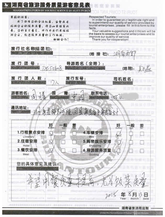 8月初,湖南邵陽(yáng)周先生一行17位貴賓與湖南西部(張家界)中國(guó)國(guó)際旅行社工作人員——小王取得聯(lián)系,經(jīng)過(guò)商談,雙方達(dá)成協(xié)議并簽訂旅游合同,于8月9日抵達(dá)張家界,開始張家界之旅。此次行程是由我社優(yōu)秀導(dǎo)游——吳飛燕負(fù)責(zé)旅游接待工作,吳導(dǎo)在旅游過(guò)程中講解詳細(xì),客人也很滿意,在意見表上要求我們:希望用餐質(zhì)量提商,尤為飯菜質(zhì)量,我們感謝周先生為我社提出了寶貴意見,謝謝周先生。同時(shí)也感謝周先生選擇湖南西部(張家界)中國(guó)國(guó)際旅行社,以及您對(duì)湖南西部國(guó)旅的信任與支持。我們會(huì)繼續(xù)努力,做好旅游接待工作。期待下一次與您的合作,祝您愉快!