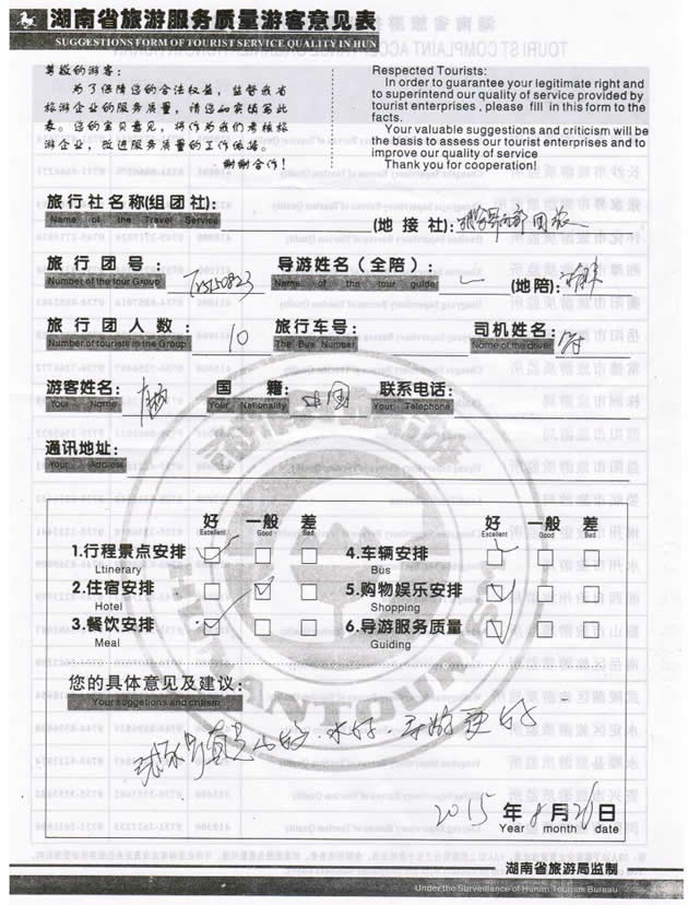 現(xiàn)在位置:首頁 -> 西部國旅->旅游質(zhì)量反饋 -> 2015-8-23 江蘇肖女士一行10位貴賓 天門山、張家界、天子山、黃龍洞三日游