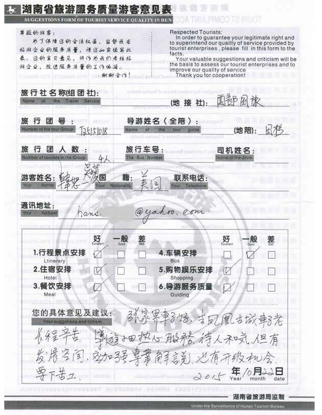 現(xiàn)在位置:首頁(yè) -> 西部國(guó)旅->旅游質(zhì)量反饋 -> 2015-10-18 臺(tái)灣韓先生一行4位貴賓 天門(mén)山、張家界、天子山、鳳凰古城四日游