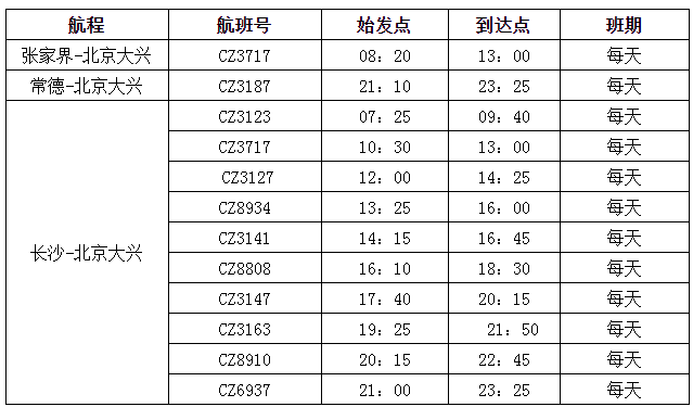 南航冬春換季后還全面優(yōu)化了各地往返北京大興的航線網(wǎng)絡。其中,張家界至北京大興航班為每天一班的朝發(fā)夕歸航班,去程CZ3717(張家界-大興)航班08:20張家界出港,回程CZ3164(大興-張家界)航班17:50北京大興起飛,時刻非常方便出行,張家界始發(fā)至大興單程僅450元起(不含稅)。常德每天往返北京大興1班;長沙每天往返大興10班(2班為寬體機),均提供“精品航線”服務。此外,北京大興往返廣州、深圳、上海、長沙、貴陽、珠海、?、三亞、哈爾濱、大連、杭州、重慶、西安、烏魯木齊等全國主要城市均為早中晚全天候航班布局,方便旅客航空出行和中轉(zhuǎn)銜接。